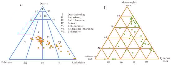 Plot of sandstone and rock characteristics in the Bonan Sag: (a) lithological characteristics of Es4x; (b) ternary diagram showing the respective rock contents (after []).