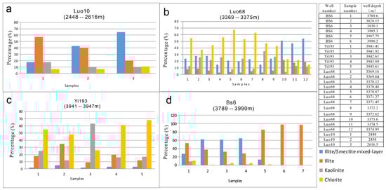 Histogram showing the clay mineral content in different environments of Es4x in the Bonan Sag; (a) feeder fan; (b) flood plain; (c) distributary channel; (d) basinal fan.