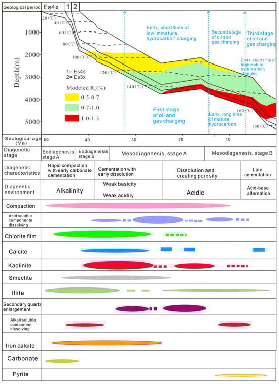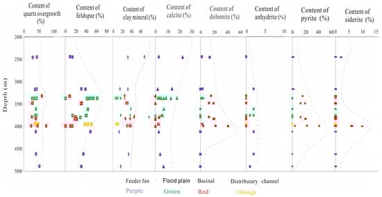 Carbonate mineral cementation: The formation of carbonate cements in sandstones can occur through several processes of diagenesis [], and carbonate cements are well developed in semiarid-to-arid environments [,]. The interval with a high carbonate cement content lies between depths of 3000 and 4000 m (Figure 9). The predominant types of carbonate cements encountered in Es4x are calcite and dolomite. Calcite is more widespread in flood plain zones, whereas dolomite appears mostly in the basinal zone. These carbonate cements of early diagenetic origin commonly replace other components, such as quartz, feldspar, and rock fragment grains. Furthermore, carbonate cements can permeate fractures of varying scales. The subsequent cementation of carbonate minerals also leads to the deterioration of the physical properties of the reservoir. The distributary floods plain and feeder zone subfacies, which exhibit a high degree of heterogeneity in terms of their base content, tend to have relatively high occurrence rates of late-stage carbonate cementation as a result of the deficiency of chlorite encrustation. Additionally, common calcite and iron calcite cementation, along with sulfide cementation, such as pyrite cementation, can be observed (Figure 7e–l).