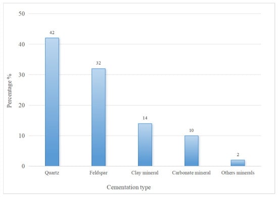 The burial of sedimentary deposits leads to undeniable increases in temperature and pressure. This gradual alteration in environmental parameters has a significant effect on clay minerals, which are subject to either recrystallization or transformation through the influence of water []. Compaction, carbonate cementation, gypsum and ankerite cementation, feldspar and carbonate dissolution, quartz overgrowth cementation, and clay mineral cementation and transformation were among the diagenesis phases that the reservoirs experienced. Cementation obstructs diagenetic processes that reduce the physical properties of reservoirs, such as porosity and permeability, during the diverse phases of diagenesis. Cementation is dominated by quartz cementation, and depending on the cement type, the examples detailed below can be distinguished.