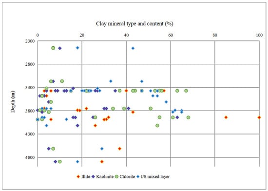 Clay and chlorite cementation: The pores of the Es4x sandstone in the Bonan area host a diverse range of clay minerals. Among them, the most prevalent are mixed I/S layers and illite, as depicted in Figure 10. The clay mineral distribution of the terminal fan is classified into three vertical transformation zones, as in all types of cement distribution. There is an early cementation zone between 2400 and 3200 m, which develops mainly in the feeder influent zone. Second, there is an intense cementation zone, which ranges between 3300 and 4000 m, exclusively comprising the wells of the distributary and basinal zones such as clay and dolomite cements that are greater than 40% (Figure 7h and Figure 10). The last vertical transformation zone lies between 4000 and 5500 m. This zone is a zone of late cementation, which involves only wells from the feeder zone. Among the samples analyzed, the average percentages of illite and kaolinite are 33% and 15%, respectively (Figure 10).