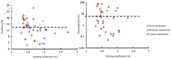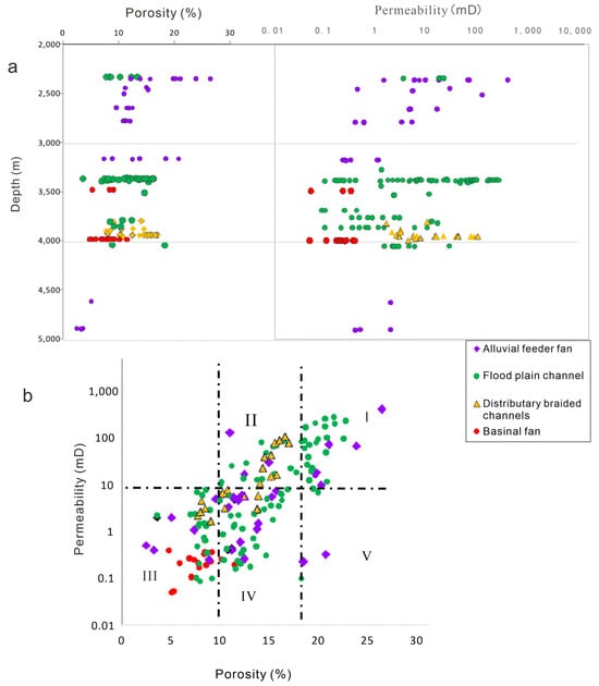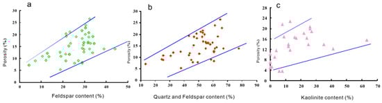 Owing to the different hydrodynamic forces that flow through these different sedimentary zones and the obvious differences in the resulting sedimentary structures, the type and intensity of subsequent diagenesis significantly impact the physical properties of the resulting reservoirs in the different sedimentary zones. The submerged diversion channel in front of the fan delta is a highly hydrodynamic sedimentary zone, and coarse-grained sediments are dominant. However, depending on the proximity of the area of the deposits to the channel, the source of the materials, and the small transport of the sediments, the sediments are poorly sorted, the heterogeneous base content is high, and compaction in the reservoir is strong.