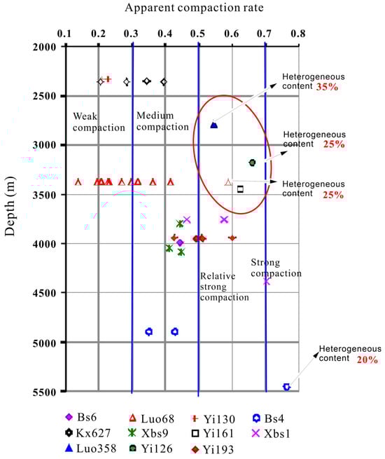 The particle support mode of the sandstone red bed reservoir in the Bonan Depression is primarily characterized by point-line contact, followed by line contact and concave–convex contact (Figure 7a–d), particularly in the peripheral alluvial fan root zones, which contain numerous heterogeneously based gravels (sandstones). These zones exhibit a high abundance of poorly sorted, soft rock fragments that are more susceptible to compaction. Due to the significant burial depth variation in the lower Es4x reservoir, the content of heterogeneous components varies considerably, resulting in pronounced spatial differences in compaction. Strong compaction predominantly occurs in mud-cemented sand and gravel reservoirs at greater burial depths, where the high mud content enhances compaction. The enrichment of soft rock fragments at these depths leads to a complete loss of primary porosity (Figure 18). Statistical analysis indicates that the average porosity loss due to compaction is approximately 13.3%, accounting for about 38% of the initial pore volume. Therefore, compaction is identified as the primary factor contributing to the densification of the red bedded clastic reservoirs in the study area.