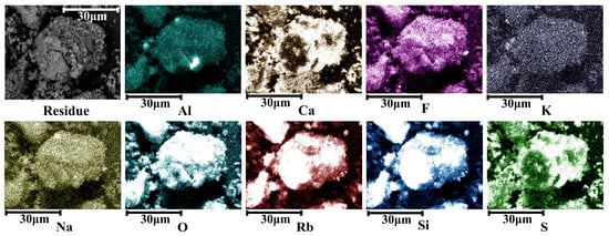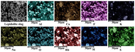 Figure 12 depicts the elemental distribution of residues following the leaching of lepidolite slag. After leaching, the surface of the slag is coated with a layer of calcium sulfate. This is likely due to the common ion effect, which leads to the precipitation of additional calcium sulfate. The degree of overlap between rubidium (Rb) and the elements sodium (Na) and aluminum (Al) decreased after the reaction, likely due to the disappearance of hauyne. This result aligns well with the XRD analysis findings.