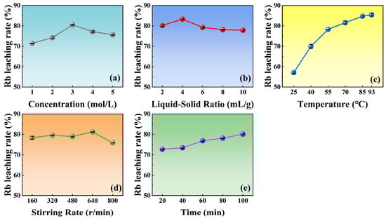 Under the conditions of using deionized water at 60 °C, with a liquid-to-solid ratio of 10 and a stirring rate of 480 r/min for 1 h, the leaching rate of rubidium from lepidolite slag was only 8.88%. Sulfuric acid, known for its low cost and easy availability, is employed as a leaching agent to enhance the leaching rate of rubidium.