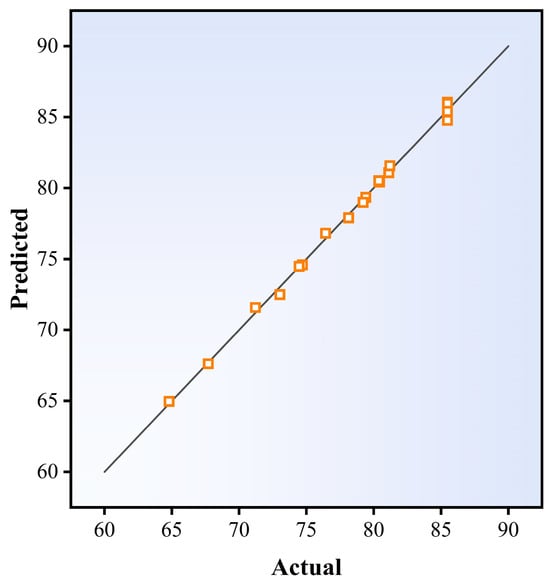 Table 6, each model component demonstrates a certain level of significance, indicating that model reduction is unnecessary. The lack-of-fit value is 0.82, indicating that the lack of fit is not significant relative to the pure error. The fitted quadratic polynomial, expressed in terms of coded factors, can represent the relationship between the leaching rate y and the factors, as shown in Equation (6).