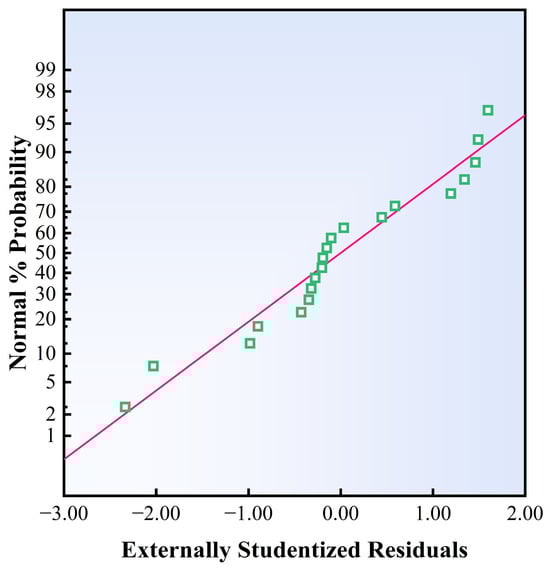 Figure 7 illustrates the normal probability plot of the externally studentized residuals. The plot demonstrates that most data points are distributed along the diagonal reference line. However, some deviations are observed at the beginning and end of the reference line. These deviations suggest the possible presence of outliers in the data or indicate that the model may not fully capture certain nonlinear effects. Although