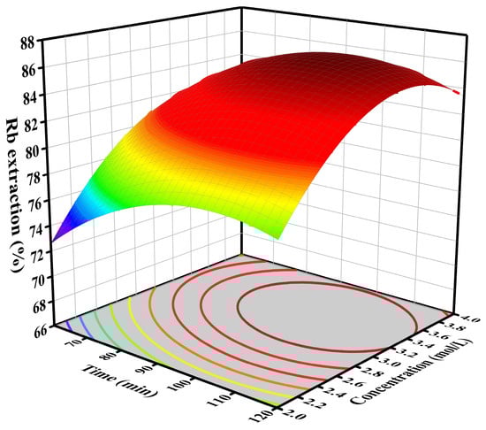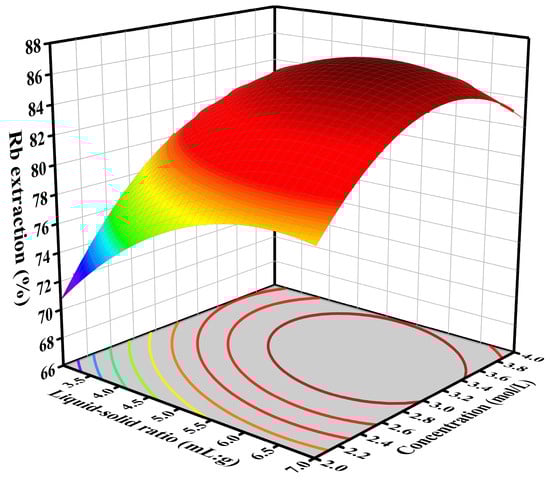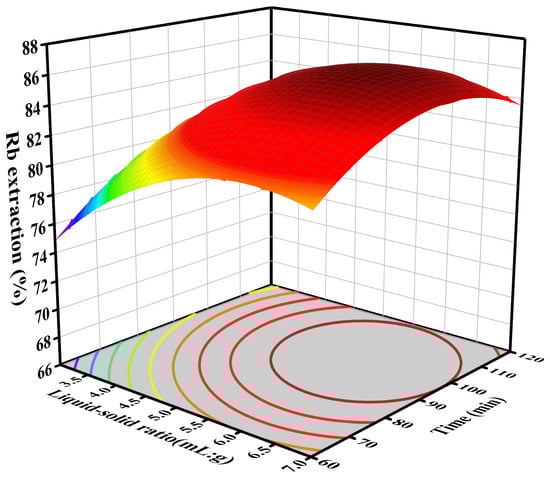 Figure 10 illustrate three-dimensional response surface plots that depict the relationship between the liquid–solid ratio, leaching time, and sulfuric acid concentration with rubidium extraction efficiency. Within the experimental parameters, it is clear that the concentration of sulfuric acid has the greatest impact on the leaching rate of rubidium.