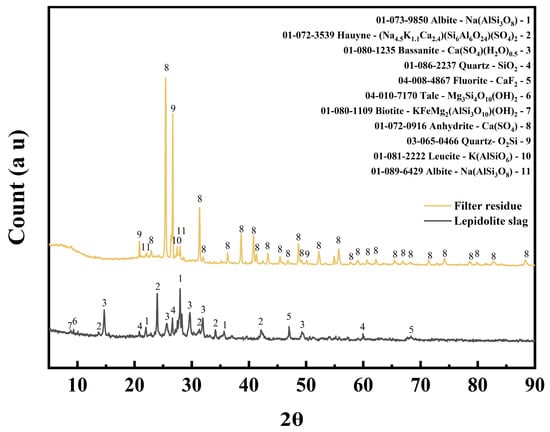 The leaching residue was dried at 105 °C for 8 h, then collected, ground, and prepared for further analysis. The solid samples before and after leaching were characterized using X-ray diffraction (XRD) and scanning electron microscopy with energy dispersive spectroscopy (SEM-EDS). The comparative XRD results are presented in