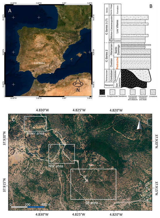 General location and settings of the lower Cambrian Pedroche Formation outcrops. (A) The Iberian Peninsula, with emphasis on the study area. (B) The chronostratigraphic section of the Sierra de Cordoba region, illustrating the major stratigraphical units, including the Lower Cambrian Pedroche Formation examined in this study (adapted from Creveling et al. [6]). (C) Geographical distribution of the three sedimentary areas within Las Ermitas, corresponding to the southeastern (SE), northwestern (NW), and inner regions of the Pedroche Formation at Las Ermitas.