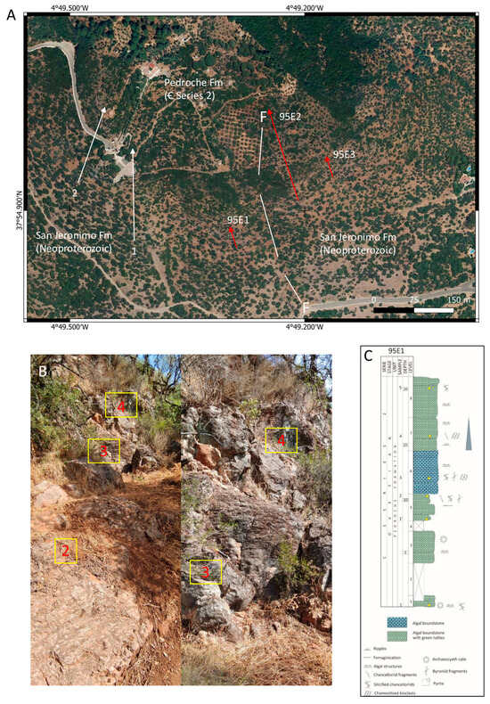 Facies in the SE area of the Pedroche Formation, tracing (A) the different stratigraphic columns (95E1, 95E2, and 95E3) as red arrows, and sections 1 and 2 (white arrows) shown in Figure S1), occurring as a resistant scarp in the Las Ermitas hillside. (B) Calcimicrobial boundstones, alter-nating with boundstones that contain greenish lutites, corresponding with levels 2 to 5 in (C) the 95E1 section.