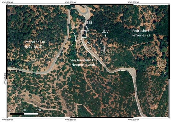 Image of the NW facies area of Pedroche Formation in Las Ermitas contacting the San Jeronimo Formation (terminal Precambrian to early Cambrian) through a major discordance. Different sections including LE/VIII (Creveling et al. [6]; Moreno-Eiris [86]), 95E5, and 95E7 (Fernandez-Remolar [29]) are traced as white arrows. Numbers 1 to 3 are targeting outcrops, shown in Figure 4A,B; Figure 5A,B and Figure 5C–D; and Figure 7, respectively.