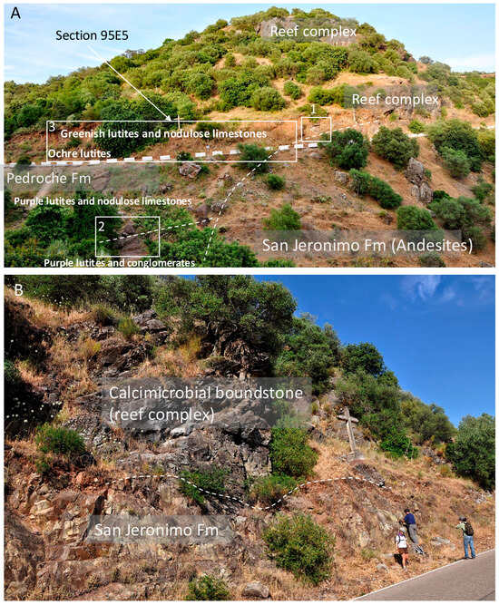 An exploration of the NW outcrops of the Pedroche Formation in Las Ermitas, revealing the facies’ variability and disconformity. (A) An illustrative depiction showcasing the three distinct sites (1 to 3), as depicted in Figure 3. These locations encompass the following: (1) The boundary between the San Jeronimo and Pedroche Formations, indicating a transition between the different rock units. (2) Conglomeratic and sandy deposits infilling a deep trough, representing sedimentary accumulation in a subsided area. (3) Lagoonal carbonates containing phosphorites, which will be thoroughly examined in Figure 4B, Figure 5 and Figure 7. This configuration demonstrates rapid facies changes within the reefal system. (B) A detailed view of the geological sequence, exhibiting andesitic materials from the San Jeronimo Formation, which are unconformably overlain by a calcimicrobial boundstone. This disconformity indicates a significant time gap or erosional event separating the two rock units. The figures provide valuable insights into the facies’ variability and disconformity, observed in the NW outcrops of the Pedroche Formation in Las Ermitas. These observations contribute to our understanding of the geological processes shaping the region and highlight the dynamic nature of the Cambrian reefal system.
