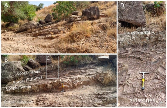 Detail of sedimentary features at sites 1 and 2. (A) Site 1 showcases the complex contact between the Pedroche and San Jeronimo Formations, where microbial carbonates fill cavities and cracks. (B) A close-up view of a cavity filled with carbonate, displaying thrombolytic and stromatolitic structures that encrust the walls and ceilings of the volcanic host rock from the San Jeronimo Formation. At site 2 (C,D), the Pedroche Formation outcrops consist of upward-fining sequences comprising conglomerates, sandstones, and purple lutites that transition into purple nodulose limestones. This sequence indicates the evolution of alluvial fans towards littoral conditions, leading to the formation of the nodulose limestones.