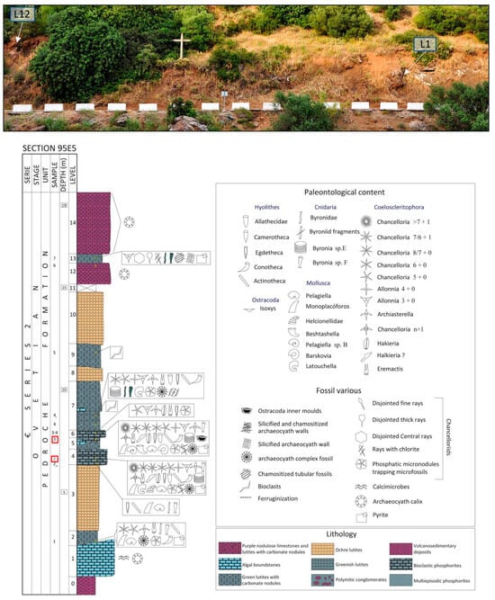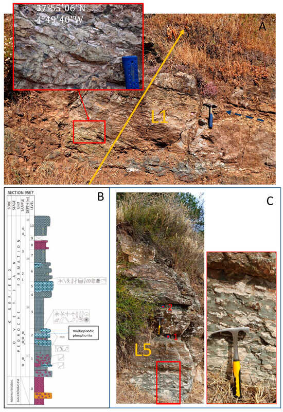 The lithological and sedimentary characteristics of the Pedroche Formation at site 4 provide valuable insights into the paleoenvironmental conditions within the lagoonal area. (A) Conspicuous conglomeratic deposits at level 1 (L1) of Section 95E7 (B) exhibit the imbrication of elongated pebbles with a discernible weathering aureole. (C) Section 95E7 also reveals the presence of alternating calcimicrobial boundstones and greenish nodulose lutites and limestones in level 5 (L5). These variations in lithology suggest dynamic fluctuations in the paleoenvironmental conditions experienced within the marginal lagoon. For a comprehensive understanding of the lithology and paleontological content in column 95E7 (B), please refer to the legend provided in Figure 7.