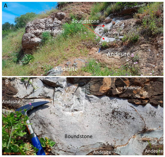 The Pedroche Formation exhibits a complex sedimentary distribution, as illustrated by (A) the infilling of cracks and cavities within the San Jeronimo Unit by boundstones. (B) A closer view reveals boundstones composed of diverse stromatolitic and thrombolytic microbial structures, which intrude into the volcanic materials of the San Jeronimo Unit.