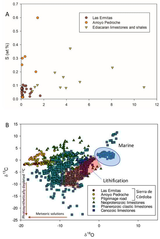 Geochemical scatterplots regarding the organic and inorganic content in the Pedroche Fm. (A) The total organic carbon (Corg) against the total sulfur (wt%) from the Cambrian rocks in Las Ermitas, compared with the same unit in the Arroyo Pedroche location [29] and the Edicaran limestones and shales from Central Spain. The scatterplot shows that the Corg average in the Las Ermitas materials is lower than the average content of the organic carbon from the mixed platform deposits of the Arroyo Pedroche location. (B) Diagram plotting 13C fractionation (δ13Ccarb) against 18O fractionation (δ18Ocarb) from carbonate samples collected in Las Ermitas and other Pedroche Fm outcrops [6]. The oxygen and carbon isotope records in Las Ermitas and the other Cordoba locations align with the Neoproterozoic and Phanerozoic isotopic record, indicating similar diagenetic processes involving meteoric solutions [135].