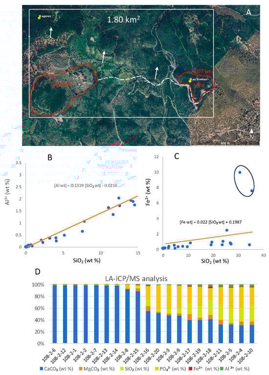 The analysis of total organic carbon (Corg) in Cambrian rocks from Las Ermitas reveals varying concentrations, with the highest being 9.45 wt% and the lowest being 0.03 wt% [88]. The average Corg content in the Las Ermitas materials (0.24 wt%) is generally lower than those found in the mixed platform deposits of the Arroyo Pedroche location (0.51 wt%) [29,86], which lack phosphates but exhibit a higher pyrite content [29,88]. The complementary distribution pattern between phosphate and pyrite (Figure 10A) suggests that the Arroyo Pedroche materials were exposed to open sea conditions, hindering phosphate formation but allowing for lower oxygen availability during early diagenesis, favoring organic matter preservation and pyrite formation.