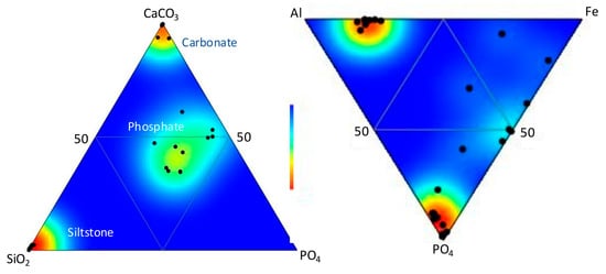 The phosphatic deposits formed in different energy conditions that were eventually exposed to high energy recurrent episodes concentrating phosphatic elements in condensed levels (Figure S6A,B). The levels are separated by sharp boundaries limited by chlorite-like rims and contain centimeter-sized elements coated by the same ferruginous phyllosilicates, which likely correspond with multiepisodic phosphorites formed by current-induced erosion and sedimentation fluctuations [37]. Their occurrence suggests that the lagoon and, therefore, the whole reefal system were affected by seasonal currents that were likely of a marine origin, as they would not influence detrital materials of continental sources [29].