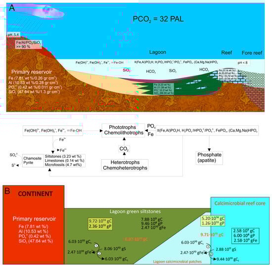 To accurately estimate the biogeochemical fluxes of P, Fe, and Si within the reefal system, it is essential to comprehensively evaluate the various components of the paleoecosystem, as these ultimately influence the biomass produced and, consequently, the quantity of organic and inorganic carbon preserved in the record. The Cambrian deposits of Las Ermitas contain a diverse paleobiological record that documents the establishment and development of the reefal ecosystem (Figure S9A). This record is substantiated by the presence of three distinct groups of fossil bodies, including a varied assemblage of phosphatized and/or silicified shelly fossils from the lagoon environment, a diverse association of reef-flanking archaeocyathids, and the reef-forming calcimicrobial structures [32,39,40,41,91,96]. Interestingly, the observation of thin sections under the microscope from the Las Ermitas paleoecological record also provides evidence that brachiopods and trilobites were likely organisms that, if not abundant, were common components of the lagoon habitat. Furthermore, the inclusion of numerous phosphatized filamentous microstructures and other complex phosphatic elements corresponding to preserved fungi (Figure S9B–E) is noteworthy [32,91,96]. Intriguingly, a significant portion of the reefal and lagoon paleoecosystem, specifically the chemolithotrophic and chemoautotrophic bacteria, was indirectly recorded in the form of ferrous deposits. These deposits will be considered in the estimation of nutrient fluxes within the reefal area. By thoroughly examining each of these ecosystem components, we can construct a comprehensive understanding of the biogeochemical processes that governed the cycling of P, Fe, and Si within the ancient reefal system. Phosphatized external molds in the lagoon deposits might correspond to microbial envelopes of phosphatized fungal mats covering various biogenic elements, such as archaeocyathid calyxes [29,88]. These heterotrophic structures, likely representing fungal colonies subjected to phosphatization, are extensively documented as mineralized hyphal networks intertwined with other biological remains (Figure S9C–E). Additionally, their association with other fossils suggests a highly active decomposing trophic level, further evidenced by the abundant production of ferrous iron in the form of Fe2+-bearing phyllosilicates within the greenish siltstones.