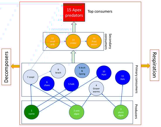In the Las Ermitas Cambrian reefal system, the energy transfer efficiency from primary producers to higher trophic levels likely followed a similar pattern to that observed in modern shallow marine environments. Lindeman’s law estimates that approximately 10% of the energy fixed by the microbial mats, early macroalgae, and potentially green and red algae in the Las Ermitas lagoon would have been transferred to the primary consumers in the ecosystem [122]. This energy would have then propagated through the food web, supporting a diverse assemblage of herbivores, detritivores, and higher trophic levels. However, as mentioned earlier, the actual energy transfer efficiency in the Las Ermitas system may have varied slightly from the 10% average, depending on the specific organisms present and the environmental conditions [123]. Nonetheless, this 10% energy transfer efficiency provides a reasonable estimate for understanding the flow of energy and the trophic structure within this ancient reefal ecosystem, highlighting the crucial role of primary producers in supporting the diverse Cambrian marine community.