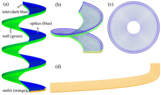 Mesh division of the computational domain of the spiral concentrator. (a) Overall computational domain mesh; (b) enlarged view of the 1.25-turn computational domain mesh; (c) enlarged top view of the computational domain mesh; and (d) mesh at the cross-section.