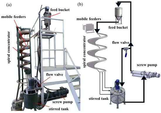 Separation test system of spiral concentrator. (a) Experimental system and (b) illustration of the separation system.