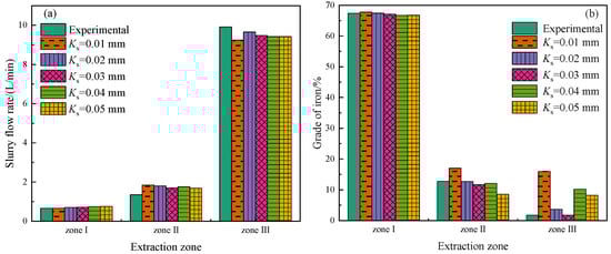 Comparison of experimental and simulated values of product indexes at different wall roughness. (a) Slurry flow rate and (b) grade of iron.