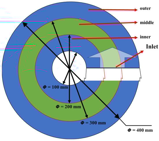 The actual production and use conditions of the spiral concentrator result in variations in trough surface wall roughness, which is not uniform. At the same time, the coarse low-density particles migrate inward and mix with the high-density particles in the middle zone, thus forming a particle mixing zone in the middle zone of the trough surface. Therefore, to investigate the effect of wall roughness variation in the middle zone on the separation process of the spiral concentrator, the 150 mm wide spiral trough surface was divided equally into three radial zones. They are the inner zone (50~100 mm), the middle zone (100~150 mm) and the outer zone (150~200 mm). The division of radial zones within the single-turn trough surface is shown schematically in Figure 5.