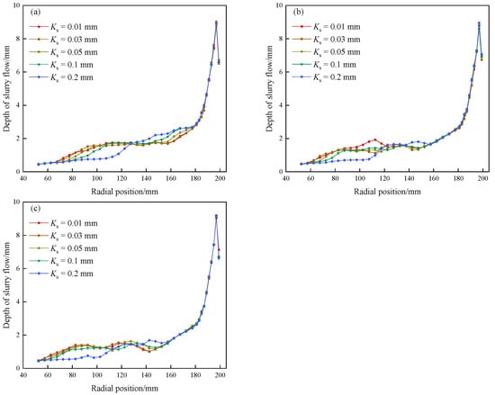 As illustrated in Figure 6, the radial distribution characteristics of the slurry flow along the trough surface demonstrate a shallow flow layer at the inner and middle zones and a deep flow layer at the outer zone. As the number of turns increases, the slurry flow gradually spreads inward, and the depth of the slurry flow in the inner edge zone increases. With the increase of wall roughness, the depth of slurry flow varies in different degrees at different stages. At the end of the first turn, the depth of slurry flow in the inner and middle zones decreases with an increase in wall roughness. The depth of slurry flow increases in the range near the outer edge (130~180 mm). At the end of the second turn, the decrease in the depth of slurry flow at the inner and middle zones slows down. The depth of slurry flow at the outer edge tends to remain constant. In the stable third turn, the slurry flow depth in the inner and middle zones exhibits a slight decrease when the wall roughness Ks value in the middle zone is increased within the range of 0.01~0.1 mm. Furthermore, an increase in wall roughness from 0.1 mm to 0.2 mm leads to a decrease in the depth of slurry flow in the inner edge zone to less than 1 mm, thereby significantly reducing the space available for sorting fluid. This suggests that increasing wall roughness in the middle zone effectively prevents the flow layer from spreading inward, reducing the distribution of slurry flow at the inner edge.