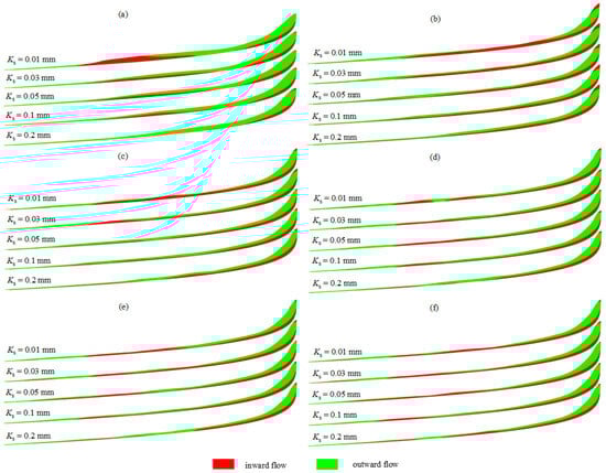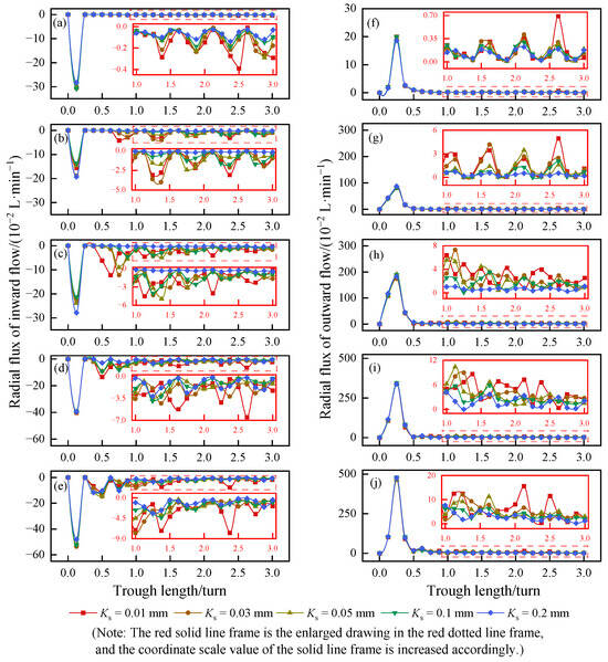 Further from Figure 9, it can be observed that the radial fluxes of both inward flow and outward flow in the inner and middle zones decrease to different degrees with increasing wall roughness of the middle zone. The radial flux of the secondary flow exhibits a negative correlation with the magnitude of the wall roughness values at 60 mm and 80 mm in the inner zone. Compared with the inner zone, the fluctuation of the radial flux of the fluid in the middle zone is increased. However, the fluctuation of the radial flux of the secondary flow in the middle zone tends to decrease with increasing wall roughness. As illustrated in Figure 9, the radial flux of the outward flow tends to decrease in the inner and middle zones, with increasing wall roughness in the middle zone.