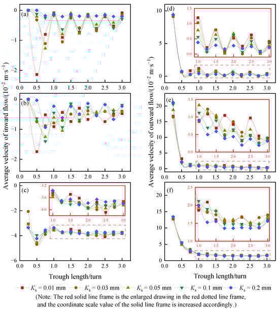 The magnitude of the secondary flow velocity is a key parameter that affects the strength of the particle motion migration behaviour. The distribution of the average velocities of the inward flow and the outward flow along the longitudinal stroke (trough length) when adjusting the wall roughness in the middle zone is shown in Figure 8.