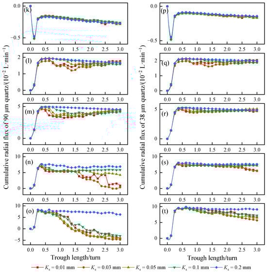 Evolution of particle radial fluxes along the longitudinal stroke with adjustment of wall roughness in the middle zone. (a) 90 μm hematite–r = 60 mm; (b) 90 μm hematite–r = 80 mm; (c) 90 μm hematite–r = 100 mm; (d) 90 μm hematite–r = 120 mm; (e) 90 μm hematite–r = 140 mm; (f) 38 μm hematite–r = 60 mm; (g) 38 μm hematite–r = 80 mm; (h) 38 μm hematite–r = 100 mm; (i) 38 μm hematite–r = 120 mm; (j) 38 μm hematite–r = 140 mm; (k) 90 μm quartz–r = 60 mm; (l) 90 μm quartz–r = 80 mm; (m) 90 μm quartz–r = 100 mm; (n) 90 μm quartz–r = 120 mm; (o) 90 μm quartz–r = 140 mm; (p) 38 μm quartz–r = 60 mm; (q) 38 μm quartz–r = 80 mm; (r) 38 μm quartz–r = 100 mm; (s) 38 μm quartz–r = 120 mm; (t) 38 μm quartz–r = 140 mm.