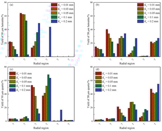 Distribution of particle yield in different radial zones with adjustment of wall roughness in the middle zone. (a) 90 μm hematite; (b) 38 μm hematite; (c) 90 μm quartz; and (d) 38 μm quartz.