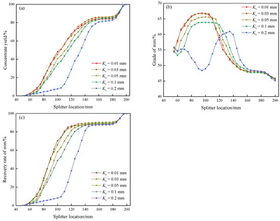 It is shown in Figure 12 that the concentrate yield increases overall with the outward shift of the splitter location (product segmentation location) under different wall roughness. Except for the condition of a Ks value of 0.2 mm, the iron grade of concentrate shows a general trend of increasing and then decreasing with the outward shift of the splitter. The highest grade of iron in the product can be obtained by intercepting the ore at the appropriate radial location. The trend in the recovery of iron is similar to the trend in yield. In addition, the highest grade of iron in concentrate is distributed in the range of 60.94%–66.83%. With the increase of wall roughness in the middle zone, the corresponding maximum grade of iron in concentrate decreased, and the location of the splitter shifted outward. Concentrate yield and the recovery of iron decreased.