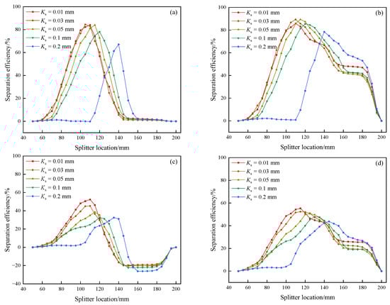 It can be observed from Figure 13 that, as the splitter location is shifted outward, the separation efficiency curves of hematite and quartz particles generally show a peaked distribution. There exists a maximum separation efficiency and an optimal product splitting location. The maximum values of separation efficiencies achieved for the four particle combinations are 83.98%, 85.84%, 52.38% and 55.33%, respectively, when the wall roughness Ks = 0.01 mm in the middle zone. It can be seen that the particle separation efficiency of 90 μm hematite, either in combination with 90 μm quartz or with 38 μm quartz, is significantly higher than that of the separation efficiency of the 38 μm hematite separation system. Both with 90 μm hematite and with 38 μm hematite, a more efficient separation is obtained with 38 μm quartz as the gangue mineral.