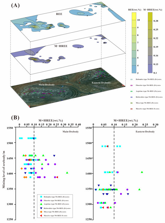 Horizontal (A) and depth (B) distribution map of REE and M+HREE in the Bayan Obo deposit.