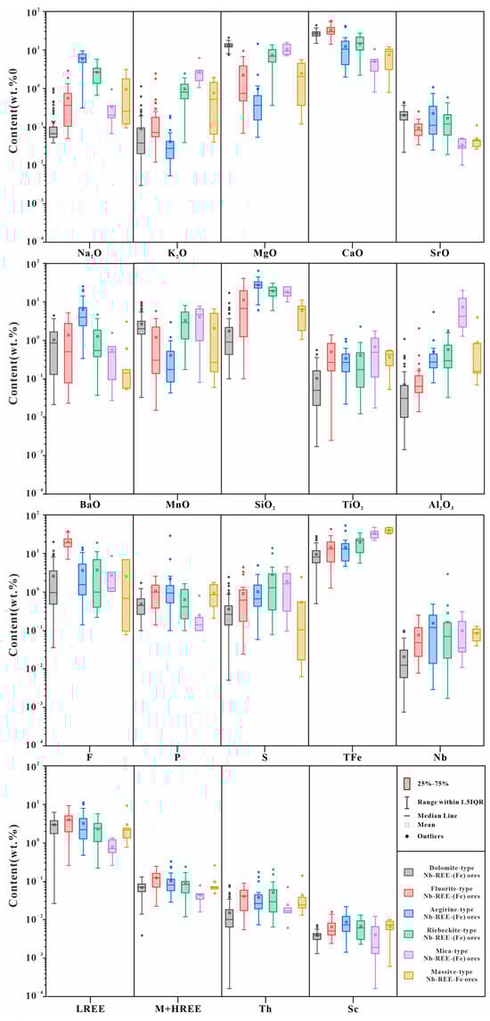 Box and whisker plots for multielement analysis of different types of ore in the Bayan Obo deposit.