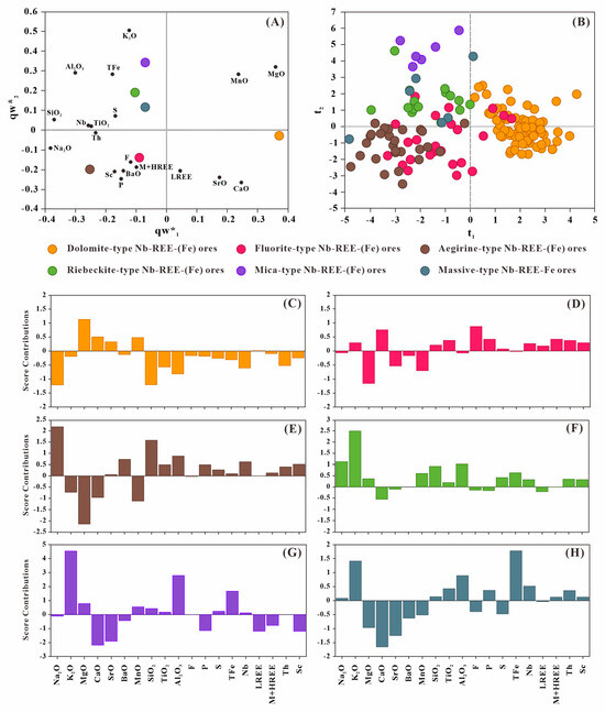PLS-DA results of the chemical composition of different ore types in Bayan Obo deposit. (A) Plot of qw*1 vs qw*2 (first and second loadings) showing correlation among elements and type of ore. (B) Plot of t1 vs t2 (first and second scores) showing the distribution of individual analyses in the latent variable space defined by qw*1–qw*2 in (A). (C–H) Score contribution plots of elements for different ore types in Bayan Obo deposit.