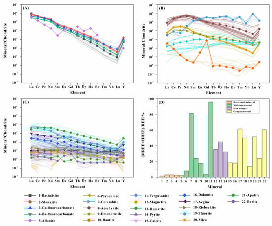 The REE content (A–C) and proportion of M+HREE/REE (D) of each mineral in the Bayan Obo deposit. (the data can be found in Supplementary Table S2).