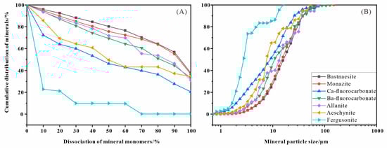 The monomer dissociation degree and particle size distribution of these seven target minerals were statistically analyzed by AMICS, and the results are presented in Table 4, Supplementary Table S3, and Supplementary Table S4. When the grinding fineness reaches below 74 μm and accounts for a 90% share, the monomer dissociation degrees of bastnäsite, monazite, Ca-fluorocarbonate, Ba-fluorocarbonate, allanite, aeschynite, and fergusonite reach 37.67%, 36.60%, 20.46%, 33.04%, 31.11%, 34.48%, and 0.07%, respectively (Figure 8A). Despite the close interconnection of the target minerals, approximately half of them remain unbound or only partially released due to their symbiotic relationship with other minerals (Table 4). When the particle size of target minerals is below 22.3 μm, the cumulative distribution rate of these seven minerals has reached 64.89%, 68.96%, 83.89%, 66.80%, 66.95%, 78.83%, and 100% (Figure 8B). This suggests that the target minerals may not only have fine particle dimensions but also exhibit complex mineral symbiosis.