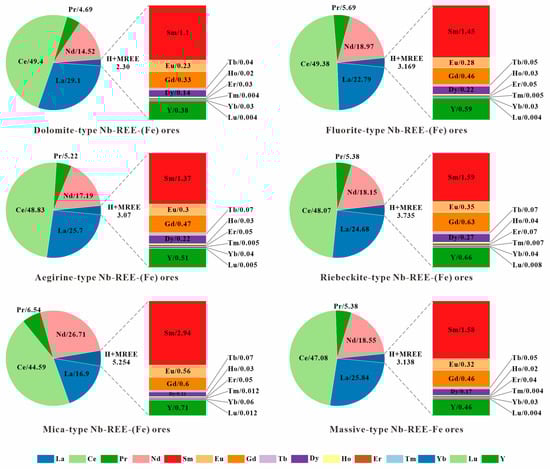 The composition of light, medium, and heavy rare earth elements in different types of ores in the Bayan Obo deposit varied widely (Figure 5). According to statistical analysis in this study, the proportions of M+HREE from highest to lowest are as follows: Mica-type ore (5.254 wt.%) > Riebeckite-type ore (3.735 wt.%) > Fluorite-type ore (3.169 wt.%) > Massive iron ore (3.138 wt.%) > Aegirine-type ore (3.07 wt.%) > Dolomite-type ore (2.30 wt.%) (Figure 9). Dolomite-type ore is the most widely distributed ore type in the Bayan Obo mining area (Figure 2). Therefore, estimated M+HREE resources can reach about several million tons according to M+HREE average concentration in the dolomite-type ore. This also led to the proportion of M+HREE in the mixed raw ore being only 3.15%.