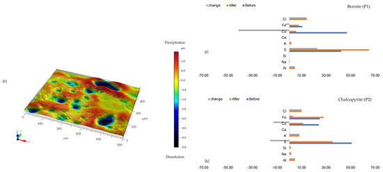 Figure 2 shows the mineralogical phase variation of the wafer per proton-promoted dissolution. There is no change in the optical (Figure 2) and compositional (Table S3 of Supplementary Materials) observation of the gangue mineralogy (mainly K and Na-Feldspars). The main difference after 30 days of the experiment was a change in the copper sulphide mineral (Figure 2). There is the preferential release of Fe ahead of Cu and S from the bornite-type copper sulphide phase (Figure 2f). On the other hand, the chemical composition of the chalcopyrite-like phase remains unchanged (Figure 2g); rather, the initial yellowish chalcopyrite surface transforms to pinkish brown, purple, and blue, indicating a bornite phase, a transition phase between bornite and covellite, and a covellite phase (Figure 2a and Figure 2b), respectively.
