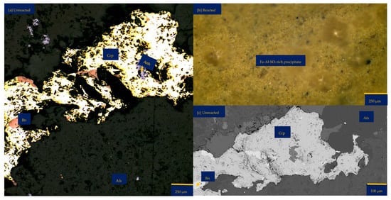 Figure 6a shows the chalcopyrite (bright yellow) and bornite (pinkish brown) in an alkaline feldspar (grey) vein prior to the leaching in an AlCl3-rich lixiviant (ionic strength of 5.243 mol/L and water activity of 0.9). After the leaching experiment, portions of the bornite appear to have been transformed into covellite (bluish). At the end of the experiment, all the copper sulphide phases (chalcopyrite and bornite) are covered by a yellowish phase, presumably an iron oxide (such as goethite and hematite—Table S3 of Supplementary Materials), with specks of blue (covellite) (Figure 6d). A black cover was also observed, presumably a Fe-SO4 phase or iron hydroxide with sulphur after Cu mobilisation from the copper sulphides. The leached BSE image revealed that the entire wafer surface, particularly at the original position of the copper sulphides, was coated in a porous and amorphous Fe-Al-SO4 phase (Figure 6c). These precipitated phases in the BSE image also showed the highest elevation in the 3D topography in Figure 6d.