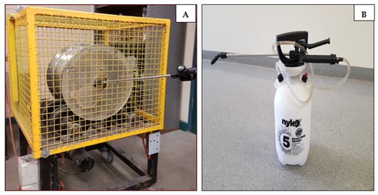 Figure 1. The laboratory scale drum granulator (A) in an enclosed guard for safe operation and (B) 5 L Nylex heavy-duty sprayer.