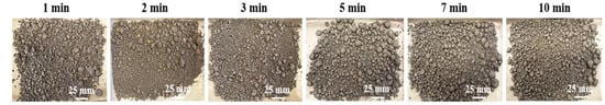 Granulation kinetics studies were conducted using SFB B10, 9.5% GMC on dry ore mass basis, 15 rpm DOS, 4–5% DVL, but with varying feed residence times of 1, 2, 3, 5, 7, and 10 min. Granulation growth behaviour depicted by the GSD and batch granulation time is presented in Figure 2 and Figure 3. The digital images of the granules produced (Figure 2) indicated a marked difference in the evolution of granule sizes and their distributions (Figure 3A) as a function of the BGT. The size distribution clearly showed that granule growth occurred within 1 min, which is typical of SFBs. Although some of the adhering fine particles formed nuclei particles, the granule growth was very fast (<1 min) due to the presence of more coarser nuclei particles, and with time, the granules generated decreased in size due to collision and increasing consolidation, as depicted by the decrease in granule mean sizes and increasing bulk density (see Table 4). As observed in Figure 3A, the granules generally showed an increase in size with increasing BGT up to 5 min, and thereafter, the granule size decreased slightly. This is an indication of reaching maximum growth at 5 min, beyond which the granules continued to fracture or break due to reaching the highest packing and lowest porosity. This observation is consistent with previous studies [27]. Therefore, it was recommended that granulation be terminated at the optimum feed batch granulation time of 5 min.