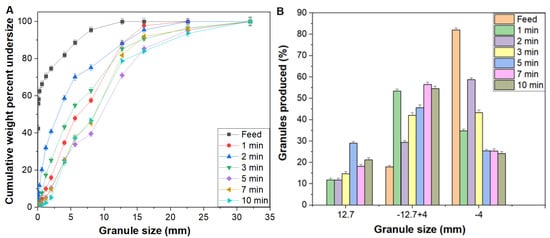 Figure 3. Granule size distribution (A) and size classes (B) of SFB B10 granulated at 9.5% GMC, 15 rpm, and 4–5% DVL as a function of feed residence time.