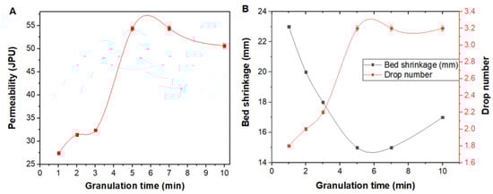 Furthermore, it was observed in Figure 4A that the permeability values for the granules increased with increasing time to 7 min, beyond which the permeability decreased. This agreed with the granule growth rate of SFB with the feed residence time. The strength of the granules depicted by bed shrinkage and drop number also showed that the granule strength improved with increasing BGT (Figure 4B). However, the strength of the granules generated within 5 min was almost similar to that for 7 and 10 min of granulation. For the granulation kinetics studies, there was a high correlation between the granule bed permeability, drop number, and bed shrinkage. BGTs of 5 and 7 min attained similar maximum permeabilities of 54.4 JPU, whilst the lowest permeability of 27.45 JPU was attained for the 1 min granulation. The attributes of granules produced with time can be used to establish the optimum duration for effective granulation. The porosity data in Table 4 also clearly show that as the BGT increased, the porosity decreased, indicating higher particle compaction and densification of the granules, as expected. Therefore, the granules produced at 5 min of the BGT had the highest bed permeability of 54.42 JPU and the lowest bed shrinkage (maximum strength) of 15 mm, thus 5 min of BGT was the optimum for this SFB.