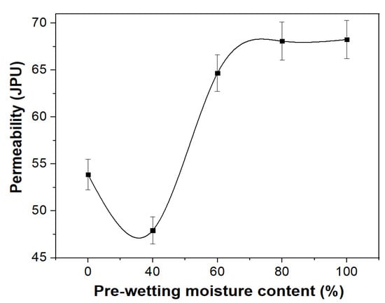 Granulation of SFB containing high levels of magnetite concentrate under different PWMCs showed some level of improvement as the PWMC increased. The bed permeabilities for the 60, 80, and 100% PWMCs were the highest, with 64.7, 68.1, and 68.3 JPU, respectively, whilst those of 0 and 40 were 53.9 and 47.9 JPU, respectively. Clearly, it was observed that the bed permeabilities generally increased with increasing PWMCs similar to the observations of Huang, Lv [25]. This was attributed to a higher uniform distribution of moisture content, increased moisture saturation, and pre-granulation. The feed without pre-wetting (i.e., pre-wetting 0%) also showed a higher bed permeability than the 40% PWMC (Figure 5), which could be attributed to insufficient moisture available to pre-wet most of the ore particles at 40% PWMC, thus causing differential wetting of the ore particles during granulation. This implies that the pre-granulation was incomplete at 40% PWMC, and the possibility of having more unwetted particles that require a higher residence time during the normal granulation process was higher than no pre-wetting. Thus, it is essential to pre-wet at higher PWMCs or not at all.