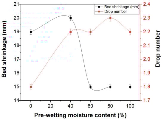 Figure 6 shows the granule strength by bed shrinkage and drop number for the pre-wetting moisture contents of 0, 40, 60, 80, and 100. The bed shrinkages were 1.9, 2, 1.5, 1.5, and 1.5 mm, whilst the drop numbers were 1.8, 2.2, 2.2, 2.3, and 2.2 for pre-wetting of 0, 40, 60, 80, and 100%, respectively. The lower the bed shrinkage, the higher the granule strength and vice versa, whilst a higher drop number depicts a higher granule strength. Therefore, the results showed that the PWMC of 40% attained the lowest bed strength, whilst the sample without pre-wetting treatment (i.e., PWMC 0%) attained the lowest drop number. The difference in the strength tests (i.e., the drop numbers and bed shrinkages) for the PWMCs of 0 and 40% could be ascribed to the strength variations in the types of granules tested, since the granules formed by the coalescence growth mechanism and pseudo layering differ in strength due to impact or compressive forces. It is believed that pseudo layered granules easily fracture upon impact to yield lower drop numbers, whilst coalesced granules composed of fines compress and flatten under a load. The bed shrinkage results correlated positively with the permeability results, more so than the drop numbers. The 60–100% PWMC samples attained a similar bed shrinkage of 15 mm, whilst their drop numbers were almost similar, ranging between 2.2 and 2.3. This signifies that the granules produced with PWMCs from 60 to 100% have equivalent granule strength.